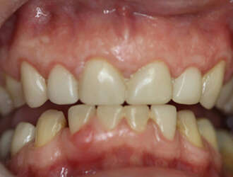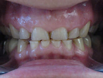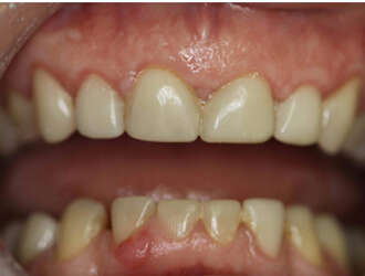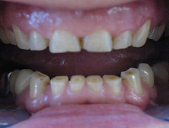 Femme de 55 ans présentant de fortes abrasions des dents antérieures suite à du bruxisme (grincement des dents), traitée par 12 facettes en 3 séances.