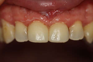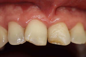 Homme de 32 ans complexé par ses incisives centrales supérieures tachées et mal positionnées, traité en une séance par deux facettes sur les dents concernées.